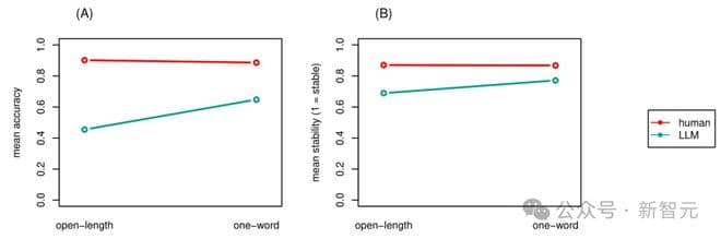 比较分析表明,人类与LLM在准确性和稳定性方面的表现存在重大差异。