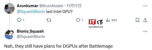 IT之家 11 月 18 日消息,X 平台消息人士 Bionic_Squash (@SquashBionic) 本月 17 日表示,英特尔对 Xe2"Battlemage" 后的未来独立显卡仍有规划。