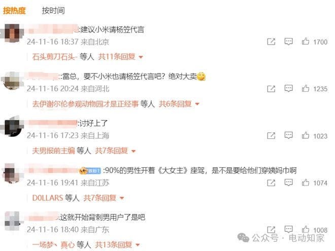 不过,雷军一条很正常的发言,却引来了评论区激烈的评论。目前评论区高达1557条评论中,点赞量最高的评论是“建议小米请杨笠代言”,点赞量高达1700个;点赞量排名第二的仍是类似的评论“雷总,要不小米也请杨笠代言吧?绝对大卖”。在所有留言中,点赞量前五的都是这类挑起对立的评论。如点赞量排名第三的评论“讨好上了”,还有评论“90%的男性开着《大女主》座驾,是不是要给他们穿xx巾啊”,“这就开始背刺男用户了是吧”。