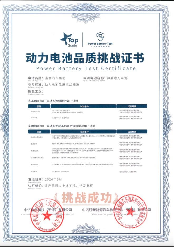 吉利新能源技术领域专家:神盾短刀电池是吉利自研、自产的最新一代「刀片式」磷酸铁锂电池,在安全性、循环寿命、快充能力和低温放电表现上,均实现了技术突破,是当前新能源汽车动力电池的最优形态。