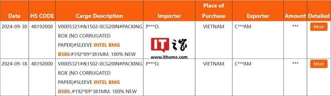 该数据库在 9 月 18 日和 30 日分别记录了一条货物描述中包含“INTEL BMG B580”的数据,采购地均为越南。