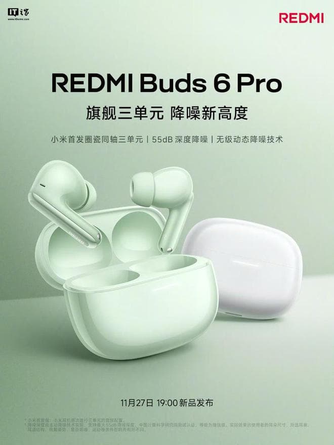 REDMI Buds 6 Pro 将于 11 月 27 日晚发布,支持 55dB 深度降噪,配备无级动态降噪技术。