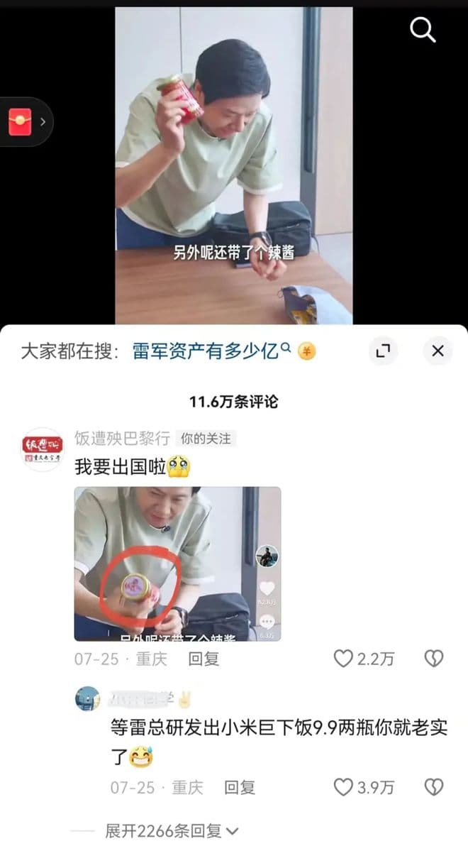 据悉,今年夏天,雷军在出发去巴黎奥运会前,发布了一期“出差好物分享”。在这条视频里,雷军的行李里面有两种辣酱。