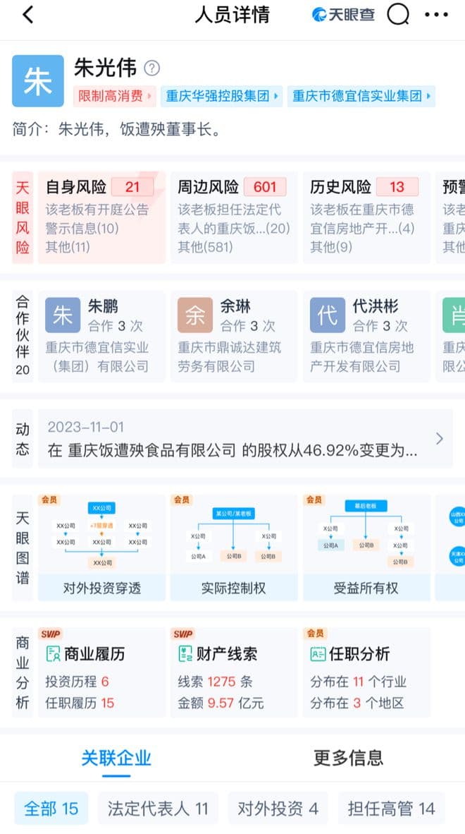 据《中国企业家》,过去几年董事长朱光伟在房地产等领域的投资经营失利,导致其面临多重司法诉讼和执行压力。天眼查显示,以朱光伟为法人代表的企业,在重庆有10多家,涉及食品加工、房地产、旅游、酒店、农贸、小额贷款等众多领域。