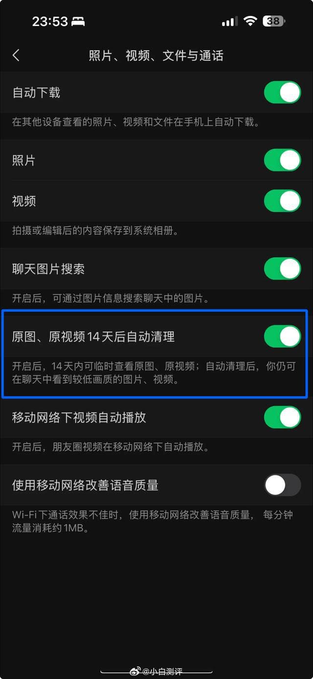 在此前的版本中,对于很久前的聊天记录里的图片,如果没有及时手动查看原图,微信会在一段时间后自动清理掉这些内容,导致无法查看。而现在,微信新增了一个选择自动清理的开关。