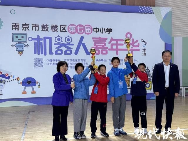 “红方,3个;蓝方1个。补给蓝方没有;红方6分。好,最终红方得16分,蓝方得11分,红方获胜。双方有没有异议?”“没有,没有。”14:09,随着裁判长宣布淘汰赛结束,南京市建宁小学的B5队和南京市长平路小学的B20队4名队员获得了联队冠军。