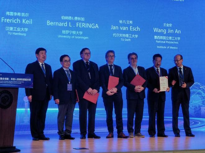 当天,在这届以“共创人类绿色智能未来”为主题的国际产学研用合作会议上,费林加院士等多位外国专家接受教育部学校规划建设发展中心副主任陈建荣、华东理工大学校长轩福贞教授颁发的聘书。这批外方导师有的专程从德国、韩国以及荷兰赶来,包括:墨西哥国立理工大学教授、墨西哥科学院院士、华理校友王金安教授,韩国明知大学徐胄源(Joo Won Suh)教授,德国汉堡工业大学弗雷李希·凯尔(Frerich Keil)教授,荷兰代尔夫特理工大学杨·凡·艾希(Jan van Esch)教授等。