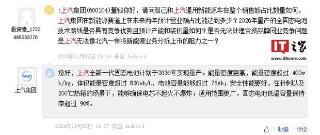 IT之家 11 月 24 日消息,上汽集团于今年 11 月 8 日在上证 e 互动回复投资者提问时表示,全新一代固态电池计划于 2026 年实现量产,其能量密度超过 400wh / kg、体积能量密度超过 820wh / L、电池容量能够超过 75Ah。