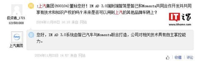 IT之家注意到,上汽还针对投资者对 IM AD 3.0 端到端智驾相关情况的提问进行解答,称“IM AD 3.0 系统由智己汽车与 Momenta 联合打造,公司对相关技术具有自主掌控能力。”关于上汽与智能驾驶公司 MOMENTA 的关系,官方则回复称“上汽集团目前是 MOMENTA 第一大外部股东。”