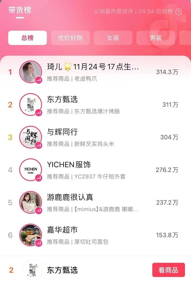 截至11月24日18点40分,东方甄选直播间点赞数达到2325.3万,观看人数达4万,在抖音带货总榜排名第二,第三名为与辉同行。