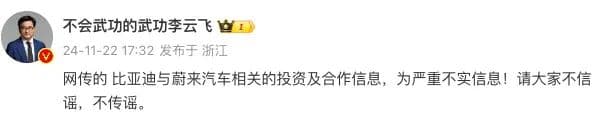 11月22日,比亚迪集团品牌及公关处总经理李云飞在其个人微博上发文称,“网传的比亚迪与蔚来汽车相关的投资及合作信息,为严重不实信息!请大家不信谣,不传谣”。上述消息也引起了蔚来公司助理副总裁马麟的关注。11月22日,马麟在其个人微博上发文回应称,“公司近况挺好,三季度现金流转正,10月毛利进一步提升,12月乐道将破万(辆)。感谢朋友们的关心和支持,我们继续加电。”