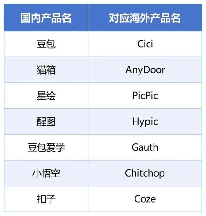 这其中,一部分产品是由国内复制到海外,如豆包——Cici;一部分由海外高排名产品复制回国内,如AnyDoor——猫箱等。