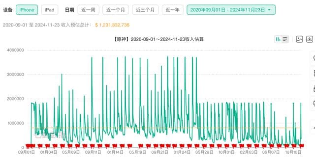 图注:《原神》在iPhone端预估营收的趋势图。数据来源:七麦数据