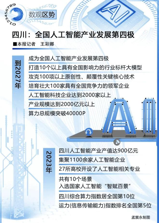 如何在日趋激烈的人工智能产业竞赛中取胜?四川要继续全力推进先进计算技术创新,筑牢数字基础设施新底座,激活数据要素新潜能,在工作机制、政策支持、人才支撑及金融服务方面统筹发力,进一步推动人工智能赋能新型工业化,培育形成新质生产力。