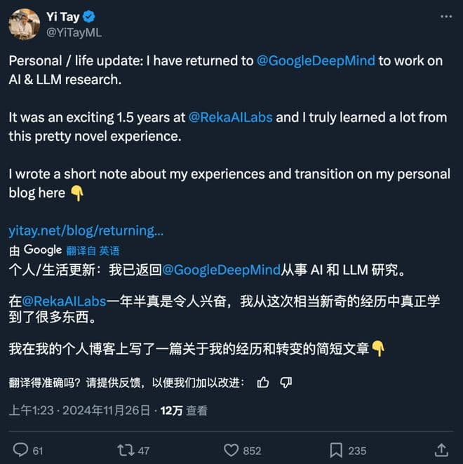 本周一,知名 AI 学者、前谷歌大脑高级研究科学家 Yi Tay 在短短一年半的创业之后官宣回到谷歌,他显得很高兴。
