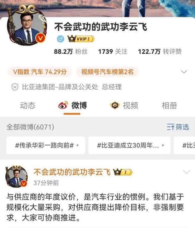 按照李云飞发布的微博消息,可以确认比亚迪与供应商在进行2025年度议价,但李云飞强调是汽车行业惯例。
