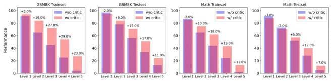 实验结论发现,无论何种模型大小, Critique 模型的存在均能显著提升模型测试性能。然而,在较为简单的数据集 GSM8K 上,更大的模型获得的帮助不如较小的模型;但在较为困难的数据集 MATH 上,性能的提升依旧显著。