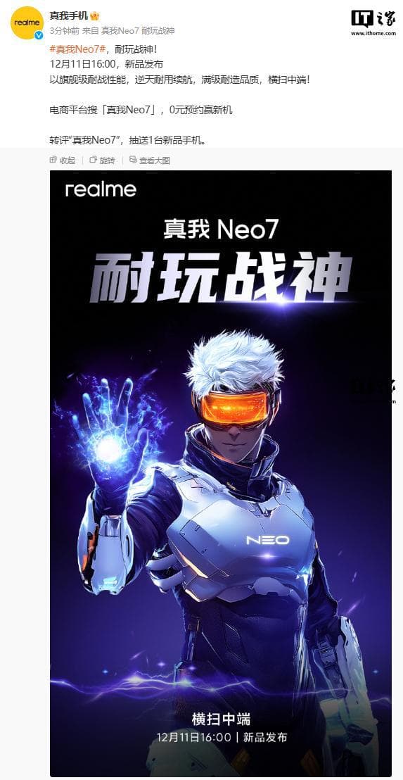 IT之家 11 月 28 日消息,realme 今日官宣真我 Neo7 手机 12 月 11 日 16:00 发布,号称“以旗舰级耐战性能,逆天耐用续航,满级耐造品质,横扫中端”。