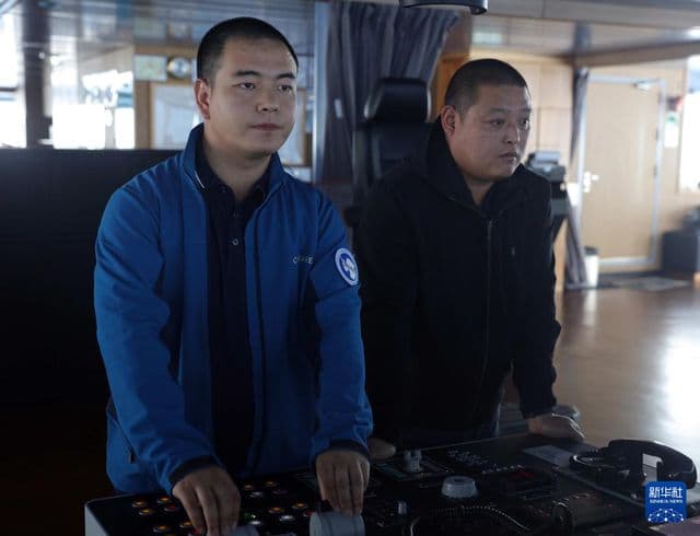 这是“雪龙2”号三副杨凯(左)和高级值班水手耿冬在驾驶台操控船只进行破冰。新华社记者 黄韬铭 摄
