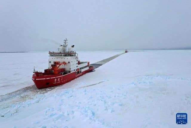这是“雪龙兄弟”在进行破冰作业(无人机照片)。新华社发(陈栋彬摄)