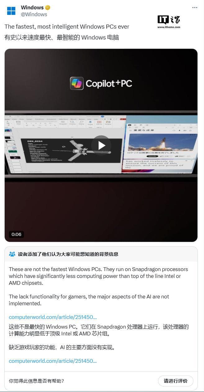 IT之家 12 月 1 日消息,微软自去年 5 月推出 Copilot+ PC 以来,一直大力推广该产品。近日,微软在社交媒体 X 上发布了一条 5 秒的短视频,声称 Copilot+ PC 是“有史以来最快、最智能的 Windows PC”。然而,这条帖子很快就被 X 平台的社区注释功能打脸。