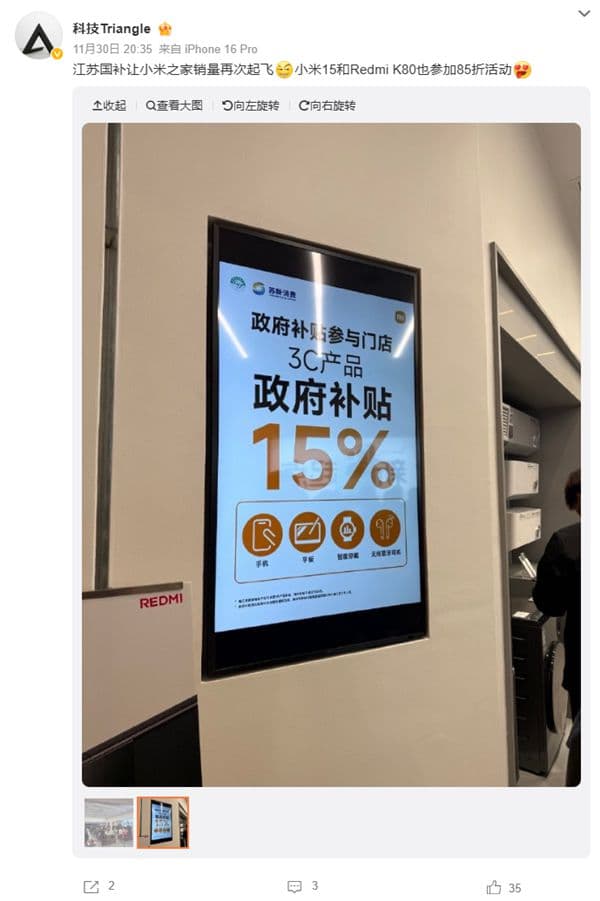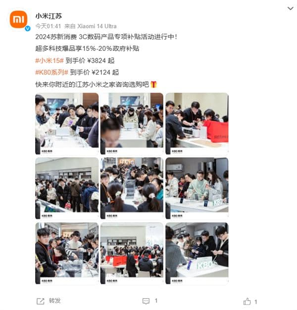 据小米江苏官微,数码补贴后,小米15到手价3824元起、REDMI K80系列到手价2124元起。