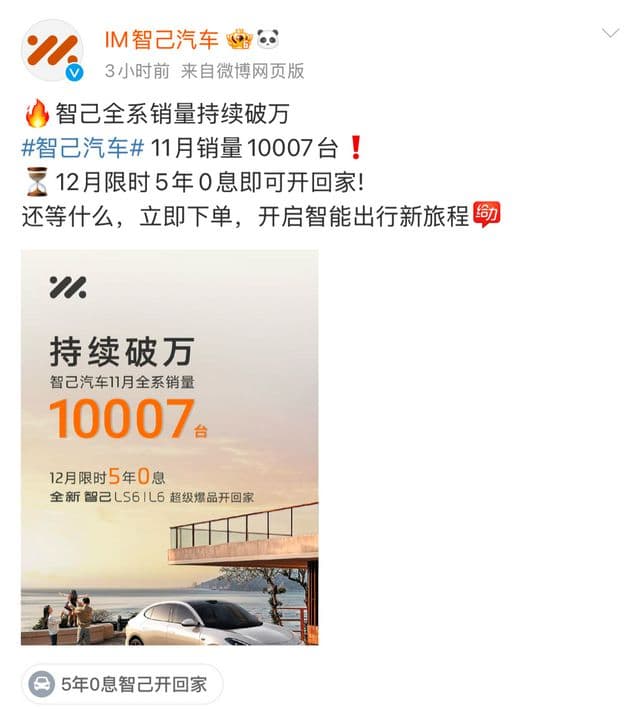 智己汽车11月全系销量10007台,与10月销量10001台基本持平,智己全系销量已持续破万。