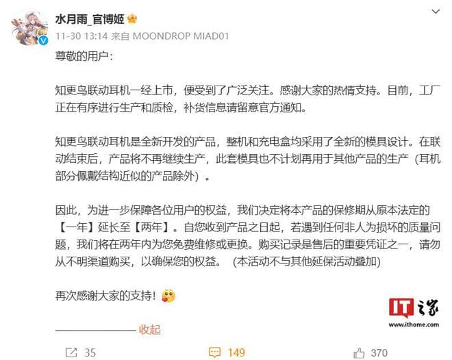 IT之家 12 月 1 日消息,水月雨官方昨日发布公告,称“知更鸟联动耳机”的保修期从原本法定的“一年”延长至“两年”,若遇到任何非人为损坏的质量问题,支持在两年内免费维修/更换。