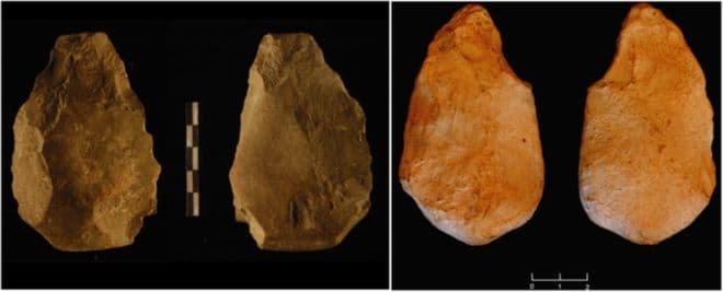 上面提到的300万年前就出现的简单石器,如“砍砸器”(choppers),它的考古发现一直延续到最近的千年。也就是说,当176万年前,人们开始通过更精细的双面剥片制作“手斧”时,那些更早期的更简单的手工技术在时间和空间上仍然广泛存在,与“手斧”的制造形成鲜明对比。后者在其首次出现后的一百多万年中的记录是间歇和稀疏的,因而它并非是正统的制作工艺。它们的稀少也支持了一个推论:从这些双面剥片石器的发明到它们在旧石器时代生活中发挥重要作用之间,可能存在数十万年的时间跨度。