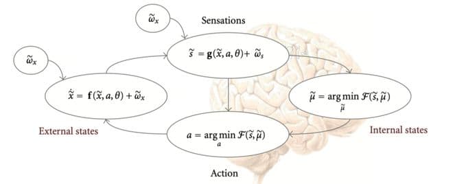 自由能原理指出,所有生物都倾向于消耗与生存相兼容的最小能量。然而,可适应环境的自组织系统却会通过主动推理,在感知预测之外对变化的环境进行反应,消耗更多的能量。这种试图最小化的能量,被定义为自由能,它可以衡量对外部的感知预测与内部信念(偏好、先验)之间的差异。可以简单地认为,感知预测是根据外部接受到的信息所进行的“客观推理”,比如走在路上遇到了下雨,我们根据对雨滴的视觉观察、触感做出自己会被淋湿的预测,而内部信念的偏好则是不希望被淋湿的主观意愿。前者与是否厌恶被淋湿无关。