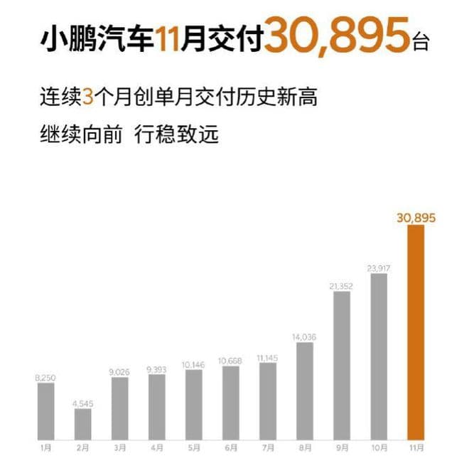 小鹏汽车11月共交付新车30895台,同比增长54%,环比增长29%。单月交付量首次突破3万,并连续3个月创单月交付历史新高。
