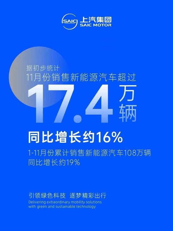 据初步统计,11月份上汽集团销售新能源汽车超过17.4万辆,同比增长约16%,1-11月份累计销售新能源汽车108万辆,同比增长约19%。