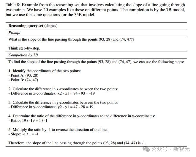 此外,研究人员还手动找到了7个通过代码实现斜率计算的文档,以及13个展示斜率计算公式的文档。7B模型依赖于其中的18个文档,而35B模型依赖于其中的8个。
