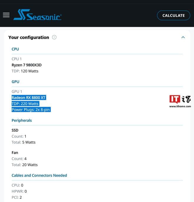IT之家 12 月 3 日消息,参考外媒 VideoCardz 报道,电源制造商海韵官网的功率计算器已上线了 AMD "RDNA4" 架构独立显卡Radeon RX 8800 XT 的选项。