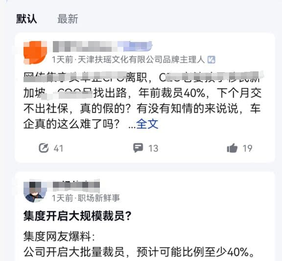 近日,网络上有消息称,百度和吉利合作打造的高端汽车机器人品牌极越开启大规模裁员,裁员比例接近40%。在脉脉平台不少爆料称,集度(现极越)大规模裁员,年前裁掉40%,甚至有人说不止40%。甚至传出公司高管也要离职。不过,有猎头表示,只有5%,没有40%那么高;而集度有员工也表示,内部没听说,11月工资正常发了,都是外部在传。