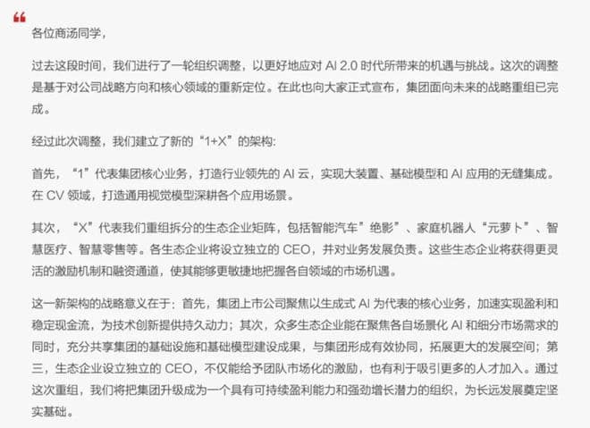 商汤科技CEO发全员信:已完成战略重组,设立新架构“1+X”,绝影、元萝卜等多个业务拆分为独立公司