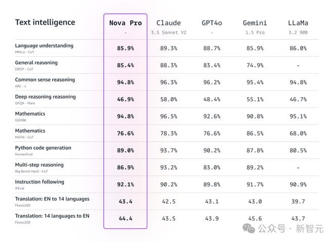 在多项基准测试中,最强的Nova Pro成功超越了GPT-4o,仅次于Gemini 1.5 Pro、Claude 3.5 Sonnet。