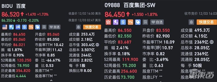▲近期百度港股美股表现