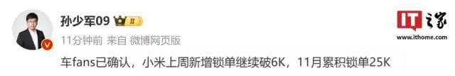 12 月 2 日,博主@孙少军09 发文称,确认小米上周新增锁单继续破 6K,11 月累积锁单 25K。