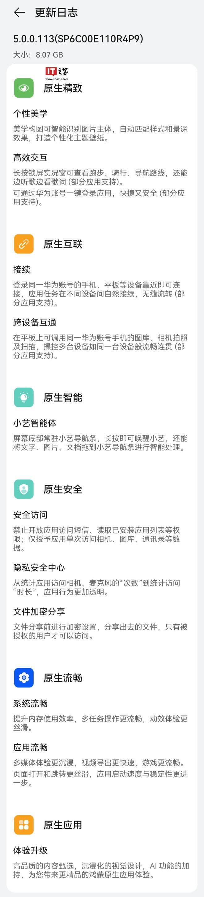 更新版本 版本号:5.0.0.113(SP6C00E110R4P9) 大小:8.07 GB原生精致个性美学 美学构图可智能识别图片主体,自动匹配样式和景深效果,打造个性化主题壁纸高效交互 长按锁屏实况窗可查看跑步、骑行、导航路线,还能边听歌边看歌词(部分应用支持) 可通过华为账号一键登录应用,快捷又安全(部分应用支持)原生互联接续 登录同一华为账号的手机、平板等设备靠近即可连接,应用任务在不同设备间自然接续,无缝流转(部分应用支持)跨设备互通 在平板上可调用同一华为账号手机的图库、相机拍照及扫描,操控多台设备如同一台设备般流畅连贯(部分应用支持)原生智能小艺智能体 屏幕底部常驻小艺导航条,长按即可唤醒小艺,还能将文字、图片、文档拖到小艺导航条进行智能处理原生安全安全访问 禁止开放应用访问短信、读取已安装应用列表等权限;仅授予应用单次访问相机、图库、通讯录等数据隐私安全中心 从统计应用访问相机、麦克风的“次数”到统计访问“时长”,应用行为更加透明文件加密分享 文件分享前进行加密设置,分享出去的文件,只有被授权的用户才可以访问原生流畅系统流畅 提升内存使用效率,多任务操作更流畅,动效体验更丝滑应用流畅 多媒体体验更沉浸,视频导出更快速,游戏更流畅 页面打开和跳转更丝滑,应用启动速度与稳定性更进一步原生应用体验升级 高品质的内容甄选,沉浸化的视觉设计,AI 功能的加持,为您带来更精品的鸿蒙原生应用体验