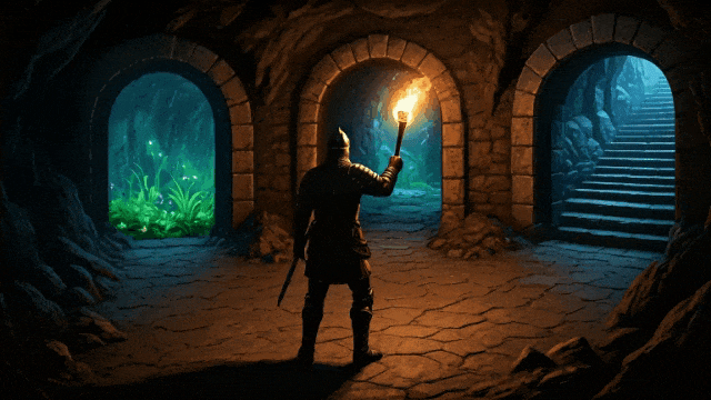 prompt:一个电脑游戏场景,展示了一座粗犷的石洞或矿洞内部。画面采用第三人称视角,镜头在主角上方俯视着。主角是一位手持长剑的骑士。骑士面前矗立着三座石砌的拱门,他可以选择进入任一道门。透过第一扇门,可以看到隧道内生长着散发荧光的奇异绿色植物。第二扇门后是一条长廊,洞壁上布满了铆接的铁板,远处隐约透出令人不安的光芒。第三扇门内则是一段粗糙的石阶,蜿蜒通向未知的高处。