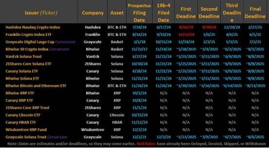 就目前而言,共有16支新的加密ETF已正式向SEC提交申请,其中Grayscale、Bitwise推出了一揽子的加密货币指数,而以VanEck、21shares、Canary、Wisdomtree为首的机构们则瞄准了山寨币ETF,Solana、XRP、Litecoin、HBAR正式成为了ETF的参与者。在即将到来的1月25日,众多ETF就将迎来第一次集中的审核期。