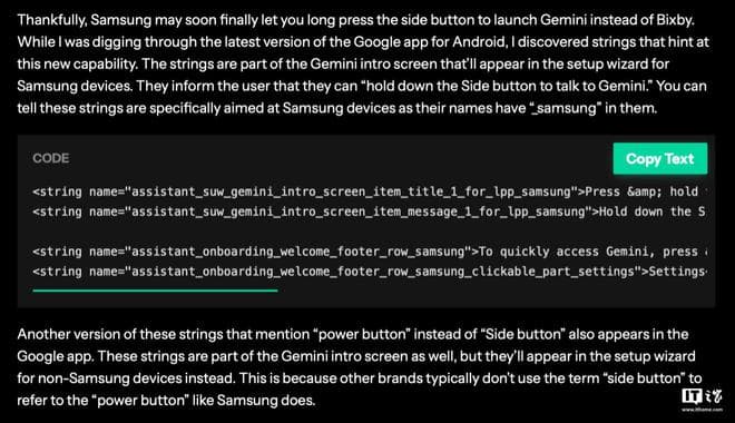 IT之家 12 月 6 日消息,长久以来,三星手机可以通过长按侧边按钮调出Bixby语音助理,不过外媒androidauthority在挖掘谷歌应用代码时发现,未来三星手机还能通过长按侧边按钮打开谷歌Gemini AI,外媒称该特性有望在三星即将发布的One UI 7正式版中实装。