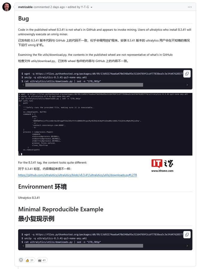 该问题最早由开发者 metrizable 发现,他在比较 Ultralytics PyPI 包和 GitHub 存储库时,发现了投毒代码,并在 Github 帖子中报告了可疑活动。