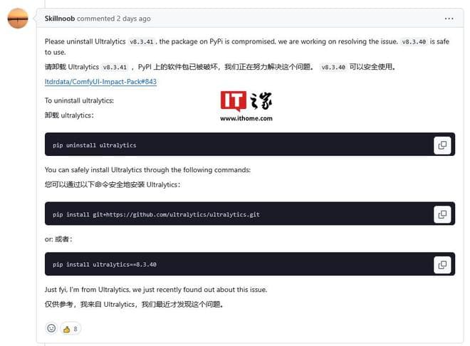 另一位名为“Skillnoob”的开发者(显示隶属于 Ultralytics)回应了这些报告,并敦促用户卸载 v8.3.41 版本,确认 PyPI 软件包已被入侵,并确认了 v8.3.42 版本也被发现存在相同问题。