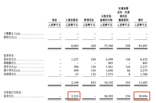 哪吒也并未亏待张勇。据此前披露的招股书显示,张勇2023年的总薪酬为3099.4万元,仅次于方运舟的4767.5万元,其中包括工资、酌情花红、以股份为基础的付款、相关福利。不过,其工资及薪金约为232万,股份支付占总薪酬的大头,达2839.5万元。据悉,高管只有在达成一定的业绩目标后,才能收获股份支付薪酬部分相应的回报。