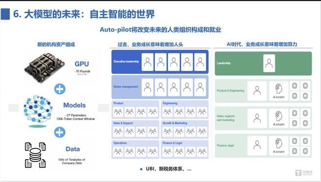 而这意味着,我们需要增加更多的GPU,训练更大模型、更强模型,以及更多的数据,这些都会成为企业的核心资产,大模型的未来对于我们生活和工作、企业组织、人员就业带来非常深刻的变化。