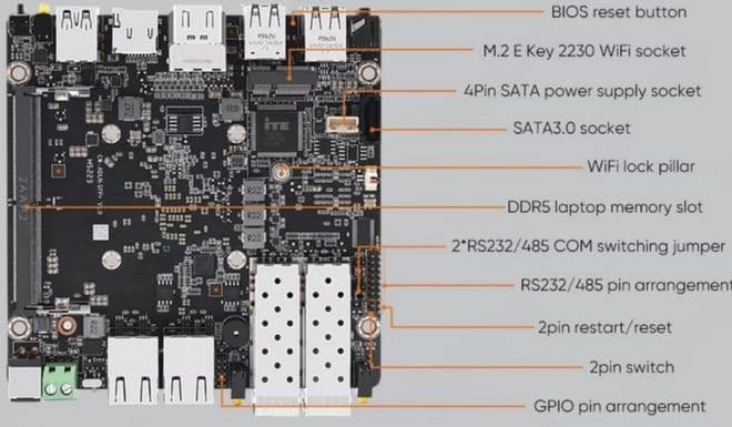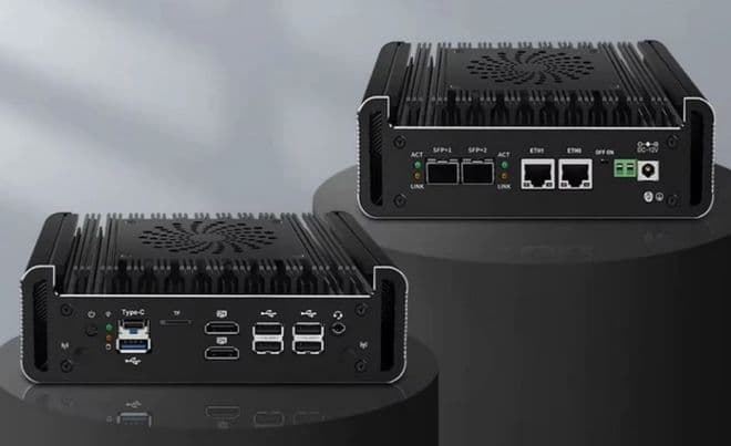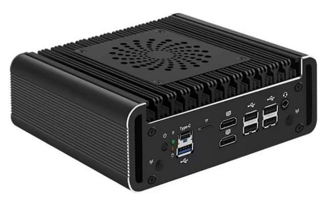 该机可选4核心英特尔N100或8核心酷睿i3-N305处理器,至高可选32GB RAM和1TB PCIe 3.0 NVMe M.2 SSD,同时提供了额外的2.5英寸SATA 3硬盘位,主机使用被动散热,顶部带有大量散热鳍片。