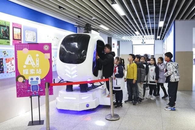 “我看了好多关于AI的奇妙活动,那个VR眼镜我戴上它就像进入了童话世界。”三年级王昱珹很开心,他正忙着和AI机器人互动。“我也想学习制作机器人,那样所有朋友都能和机器人一起玩了!”