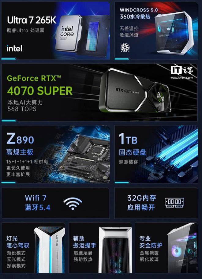 规格方面,该机采用了Z890主板,搭载20核心20线程英特尔酷睿Ultra 7 265K处理器、32GB DDR5 6400 RAM及1TB PCIe 4.0 SSD,配RTX 4070 SUPER显卡,升级WINDCROSS 6.0水冷散热系统。